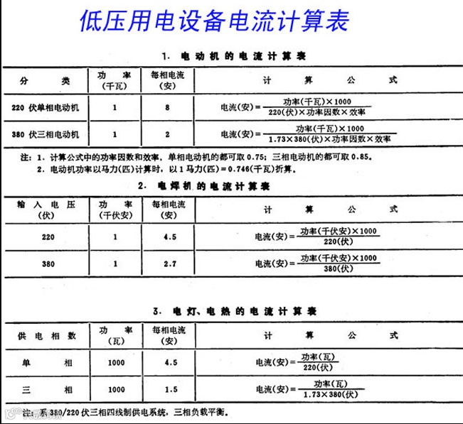 常见低压用电设备电流计算表,非常实用