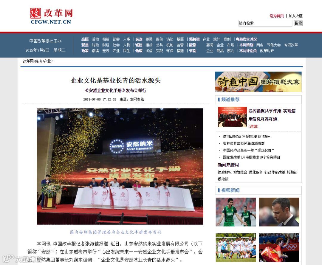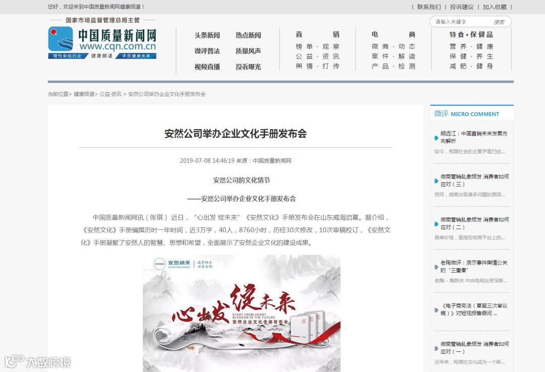 2019年7月2日,心出发 绽未来——安然企业文化手册发布会在山东威海铂丽斯国际大酒店盛大启幕。改革网、中国质量新闻网对安然企业文化手册发布会进行报道,聚焦安然企业文化建设成果。