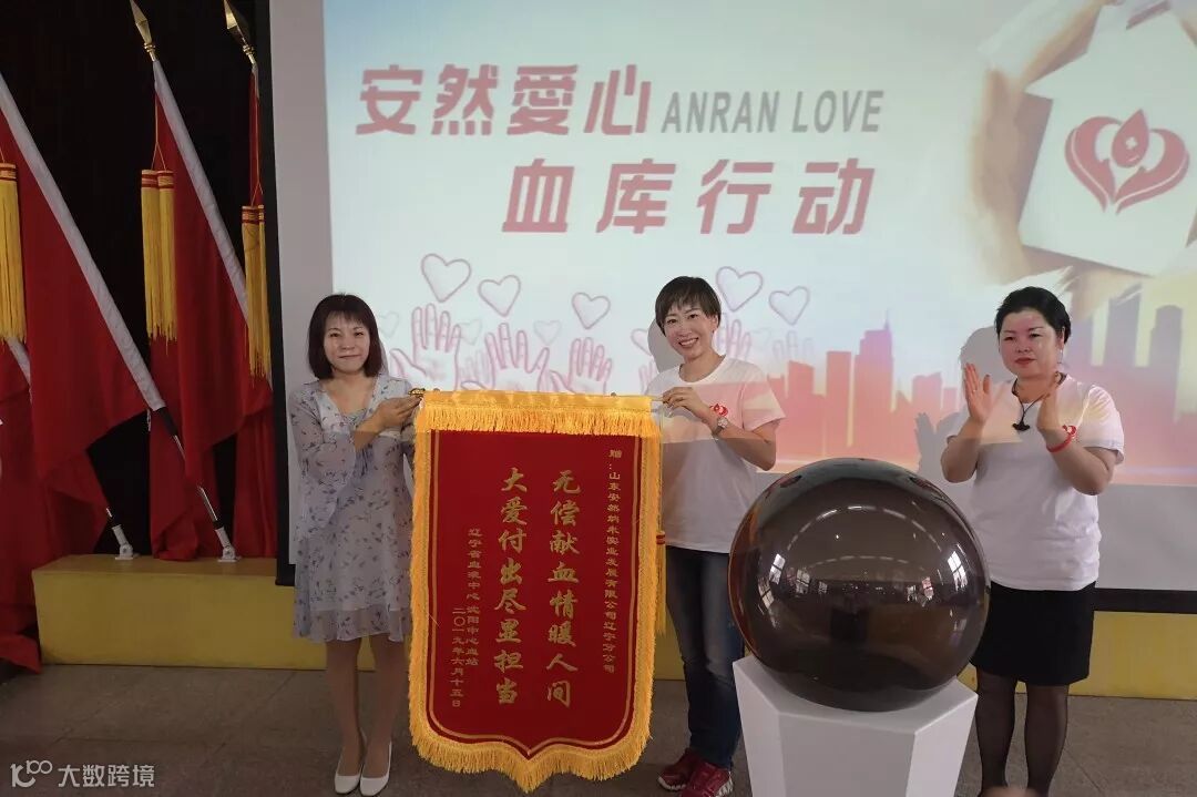 辽宁省血液中心沈阳中心血站主任刘丹(左)为安然辽宁分公司授旗