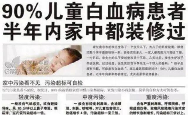 而且根据医学研究证实,装修材料中,除了甲醛外,还有诸如苯及一些未知有毒有害物质,同样会诱发儿童白血病。某医院调查显示,到医院就诊的白血病患儿90%家里曾经装修过。