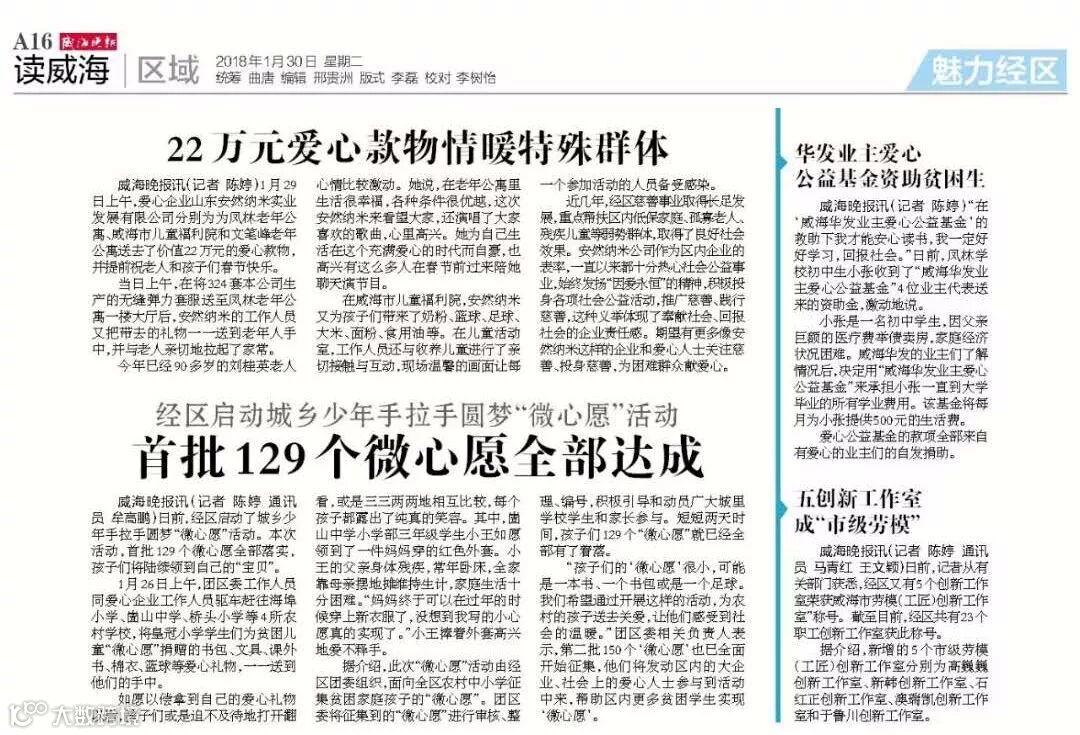 威海晚报和经区报也对安然公司爱心慈善活动进行了报道。随着企业不断的发展壮大,安然不仅帮助伙伴蜕变自我,实现梦想,同时也勇于担负社会责任,为有需要的人提供帮助,回馈社会!
