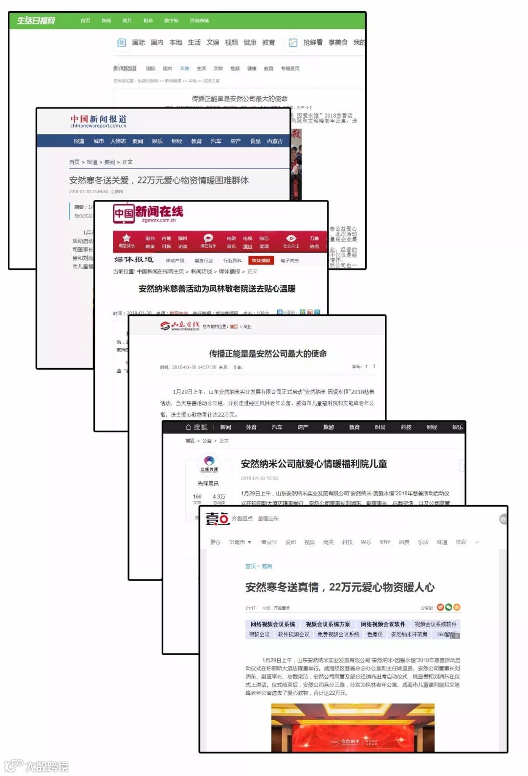 人民网、中国网、中国新闻报道、中国新闻在线、齐鲁晚报、山东在线、搜狐新闻、壹点网等新闻媒体报道了安然公司爱心慈善活动,赞扬安然公司此举给社会带来正能量,给威海的孤独老年与孩子带来温暖的情感慰藉。