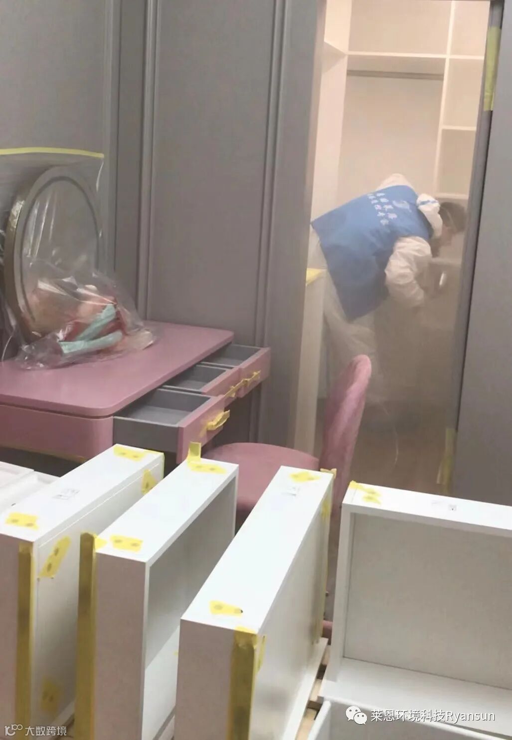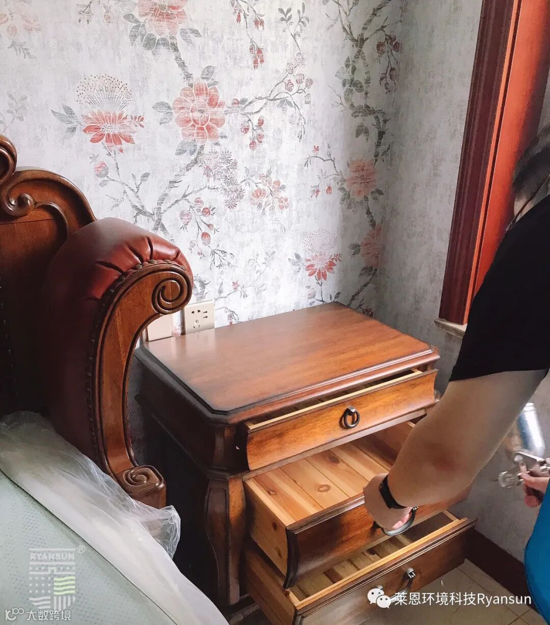 2.使用莱恩净醛因子NO.2板材专用将木制作正反面喷涂。喷涂完成后密闭上24小时,上门清理生成物后,就能获得一个无醛无毒的床头柜了。