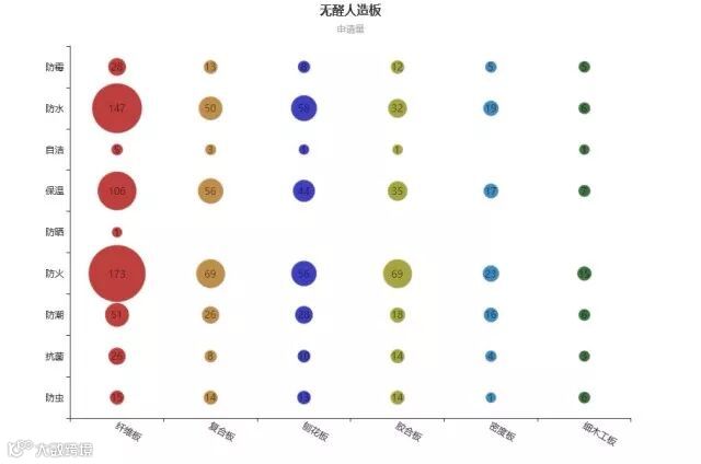 目前生产无醛人造板的技术有很多种,常见的有:使用无醛胶,采用甲醛清除剂,改进生产工艺少添加胶、甚至不添加胶等,经过分析总结,形成了不同无醛人造板生产工艺专利申请的气泡图。