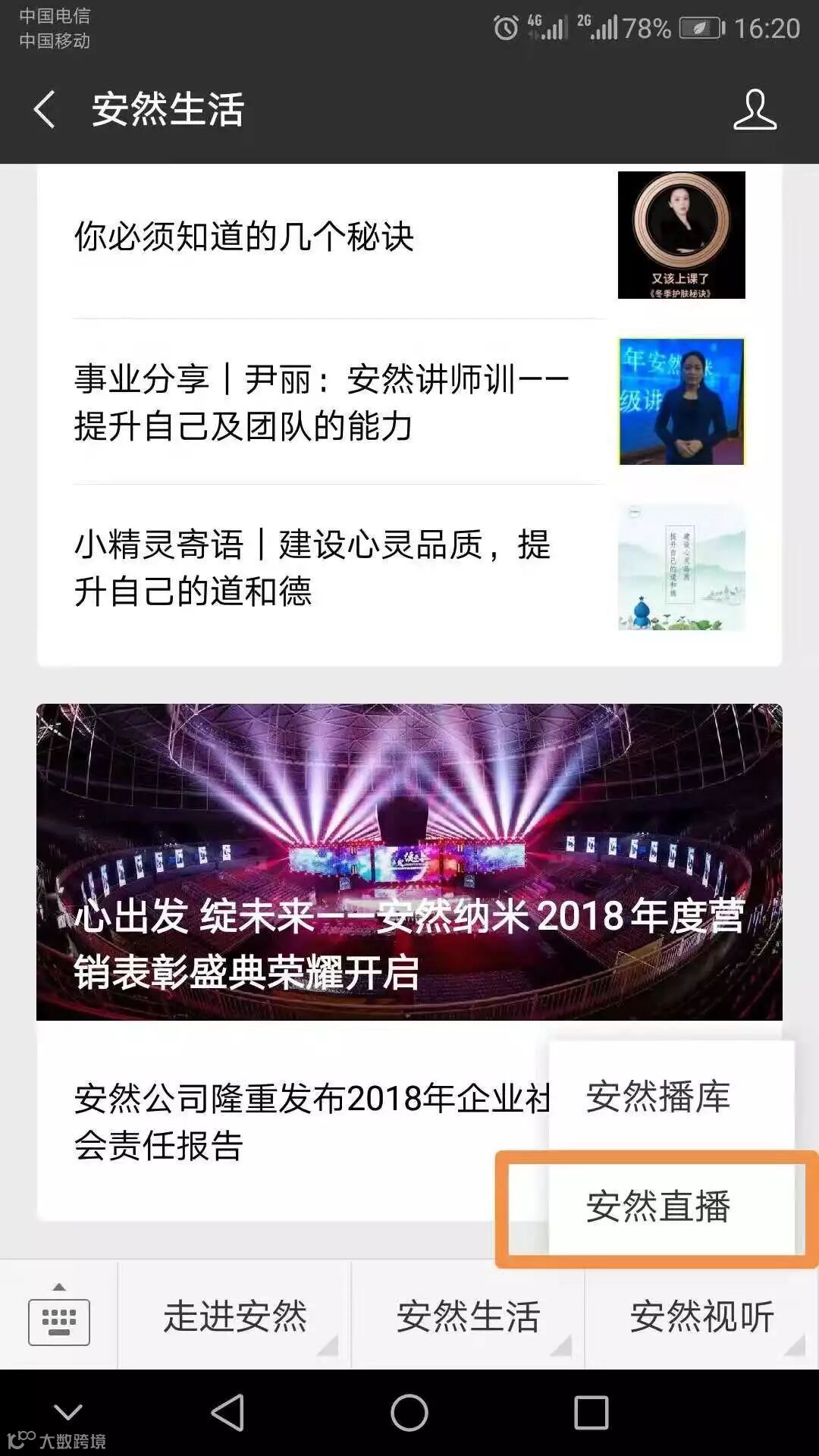 通过点击《安然生活》公众号下面的菜单中的“安然视听”里的“安然直播”进行观看。