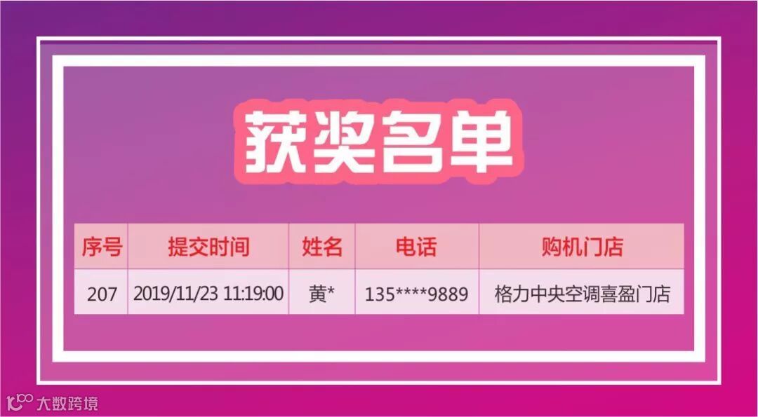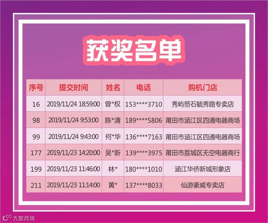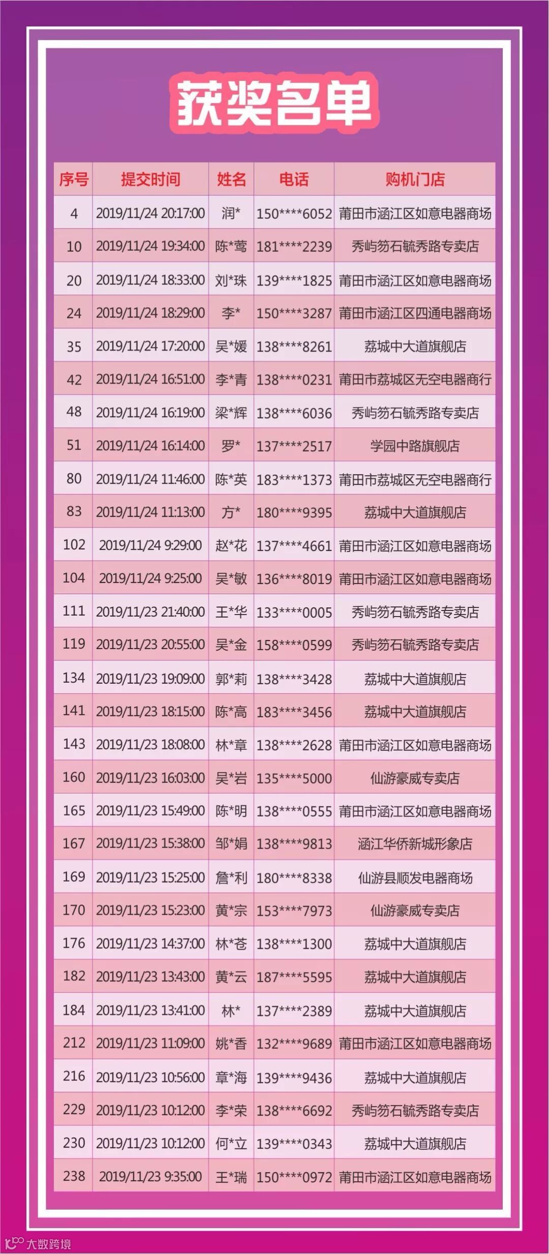 本次抽奖仅针对#全莆田 看格力#活动期间成功购机且在11月23日-11月24日23:59:59前发送凭证到指定平台的用户,请以上37位顾客务必本人带上领奖凭证进行领奖;