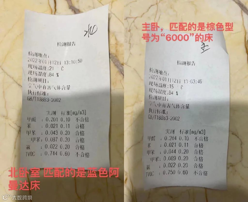 除此之外,孙小姐的家人睡过皮床后均出现了嗓子哑、扁桃体肿大、头痛的症状。因家中有小宝宝,担心皮床的刺鼻气味会影响到家人的身体健康,孙小姐找了一家检测机构,上门检测其房间是否含有甲醛等有害气体。
