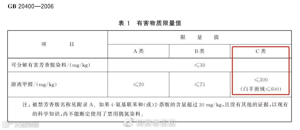 此外,客服所提供的检测报告显示,“游离甲醛”项目的标准要求是“游离甲醛≤300(白羊剪绒≤600)”。参考现行的国家标准《GB 20400-2006-皮革和毛皮 有害物质限量》,该份检测报告的检测标准为C类(非直接接触皮肤的产品),最终的检测结果为23.4mg/kg,未达到A类(婴幼儿用品)标准。