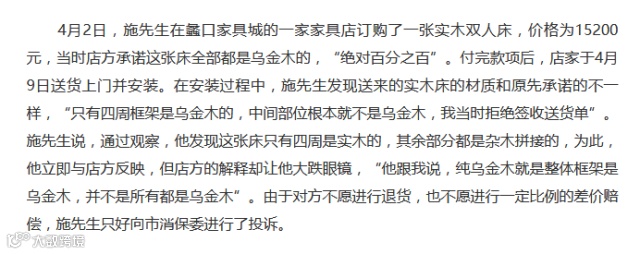 也就是说,只有家具的主体结构上使用实木结构,而门板和侧板不使用实木,同样也可以称为实木家具。这样用框架实木来偷换概念,假装实木家具卖,是商家常用的手段之一。新闻报道一搜就有不少上当受骗的,比如: