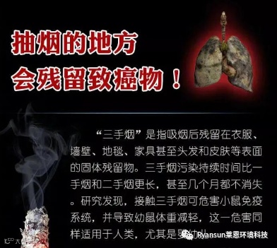 即烟雾消散后的有害物质,依旧残留在衣物、头发、胡须、皮肤,以及屋内的地毯、家具 、墙壁等表面,甚至与环境中氧化物发生反应,生成新的污染物,对人体产生严重伤害。