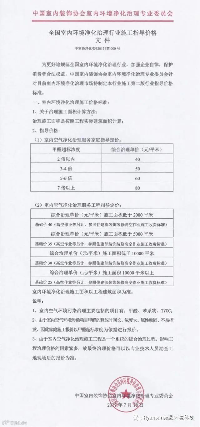 室内环境治理就是如此。作为一个关乎客户生命健康安全的环保行业,其治理效果的好坏当然不能只靠价格和宣传,产品效果保证为基础,每一步的施工步骤和每一个工序直接影响治理效果,所以治理室内装修污染不能只单单靠价格!下面一起来看看国家相关部门的标准如何定价收费。