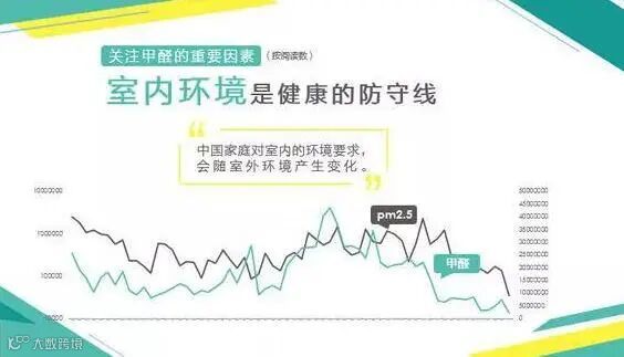 雾霾的主要成分是PM2.5。从PM2.5和甲醛的头条平台相关阅读数来看,中国家庭对室内外环境的关注波动几乎一致。这意味着,他们认为室外环境的变化将会影响到室内的环境,室内环境是挡住雾霾的健康防守线。