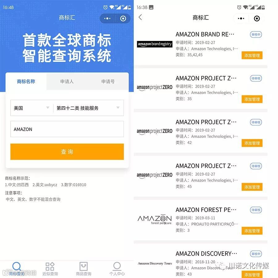 在小程序的首页中,我们可以根据商标名称、申请人、申请号等信息进行商标查询。比如我们要查询中国的“华为”、美国的“AMAZON”,包括类别、注册进度等信息都可一目了然。点击进去还可以了解申请人、地址、注册号等信息,跟官方的数据一模一样,为大家节省了不少的时间效率。