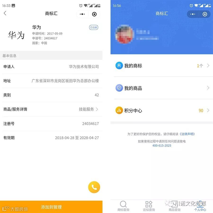 另外“添加管理”功能更是方便大家了解商标的进度,如果你添加了某个商标,那么就可以到个人中心-我的商标找到。