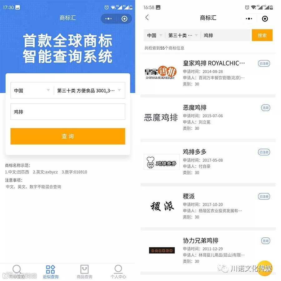 通过主页的“近似查询”,我们可以快速查询到近似商标情况,比如在“第三十类方便食品”中查找“鸡排”,我们可以查找到与“鸡排”相关的商标名称、图片以及相似的元素等。
