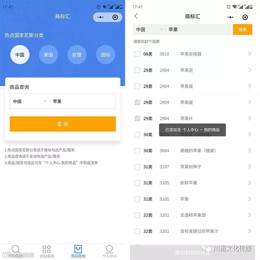在商品查询目录,我们可以查到所有热点国家尼斯分类,尼斯分类主要规定的是商品与服务分类法。该分类为商标检索、商标管理提供了很大方便。比如你查询的“苹果”,然后勾选你选要的类别,添加到我的商品,便可立马制成清单,最后还能一键复制或者分享。