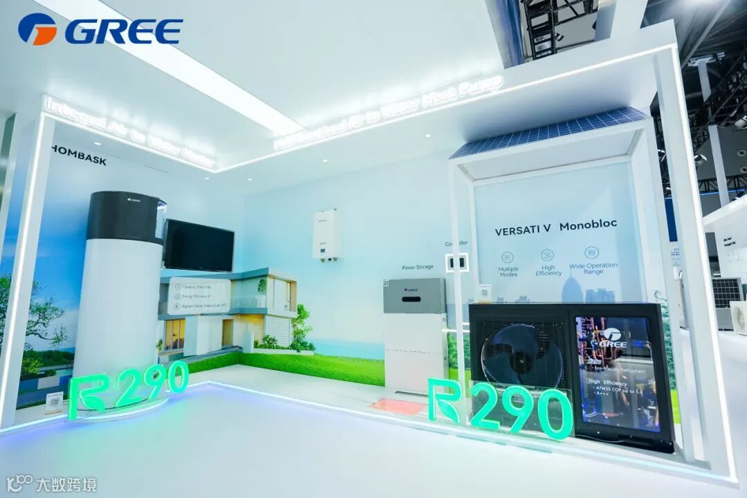 格力展出的R290多功能空气能热泵热水机Versati V集制冷、制热和制热水功能于一体,整机可搭配太阳能、燃气炉等其他热源使用,突显节能高效的特点。相较于上一代产品,Versati V具有更宽的运行范围,最高可在48℃的环境温度下制冷,-30℃环境温度下制热,出热水温度提升到最高75度,可以让用户畅快享受洗浴时光。