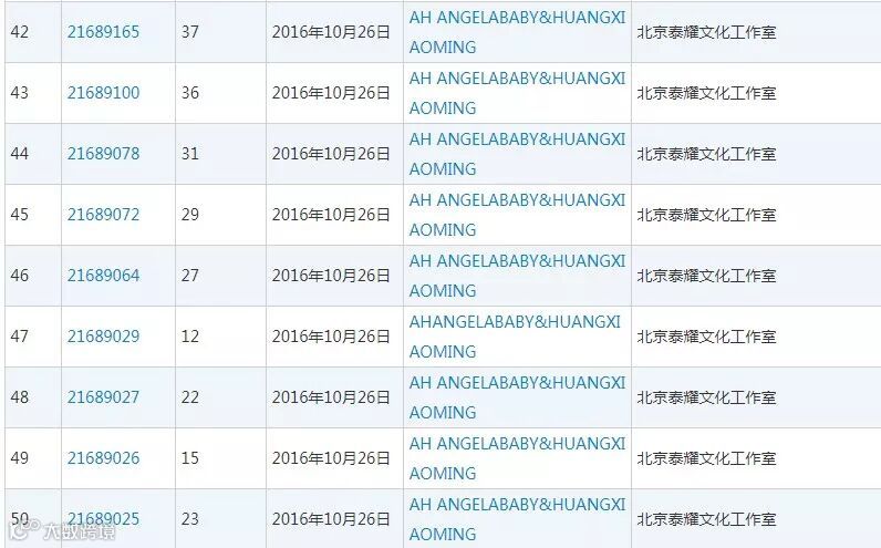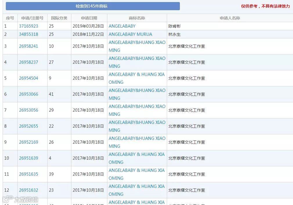 当然,baby的经纪公司也申注了不少“Angelababy”商标,早在2015年3月27日就申注了30多个“Angelababy”商标。