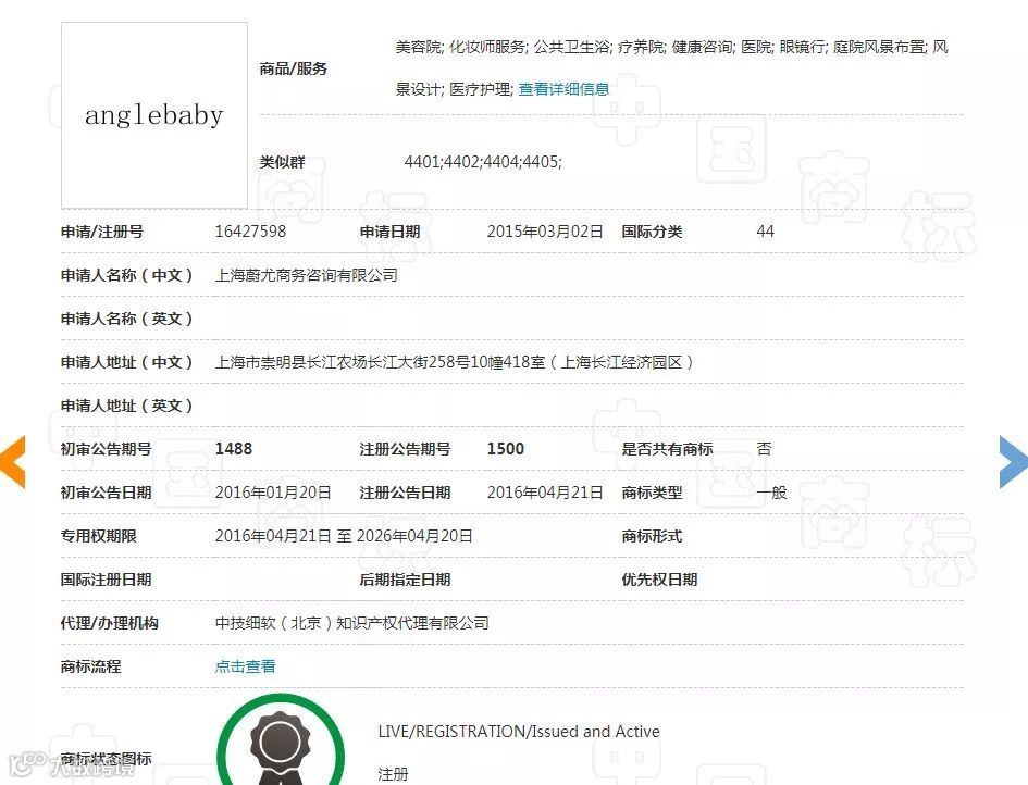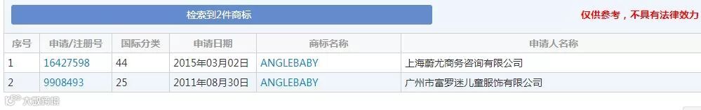 2015年3月2日,上海一家商务咨询公司申请在第44类眼镜行、美容院、健康咨询等服务范围内申注“Anglebaby”商标。初审公告日期为2016年1月20日,注册公告日期为2016年4月21日。