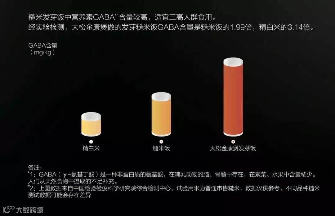 糙米发芽饭中的营养素GABA含量,就是降三高的关键营养素。经中国检验检疫科学研究综合检测中心检测,大松金康煲做出的糙米发芽饭GABA含量是糙米饭的1.99倍、精白米的3.14倍(检测报告查看)。
