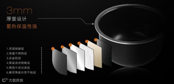 专为煲仔饭特别设计内胆——“赤焰釜”,3mm厚釜设计,蓄热保温性强,不怕吃冷饭~所以锅巴不粘可以成块刮起,洗锅不用烦!