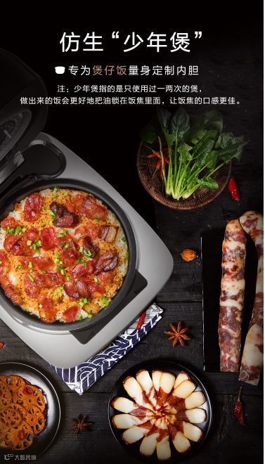 仿生“少年煲”的设计,让每次使用饭煲,都等同于少年粗陶瓦煲的效果,做出来的饭把油很好地锁在锅巴里,让锅巴的口感更佳。