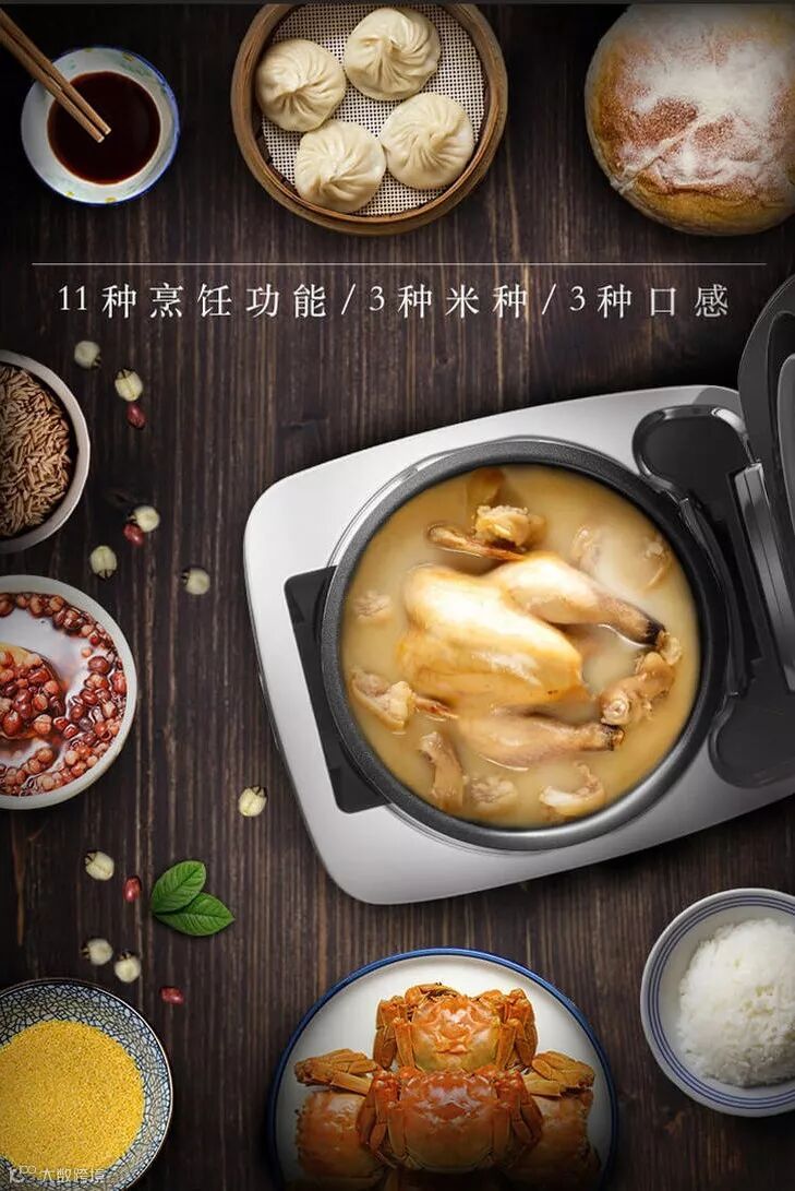 11种功能模式:快煮饭、快煮粥、煲仔饭、精煮饭、发芽饭、煮粥、稀饭、煲汤、热饭、蒸煮、蛋糕。