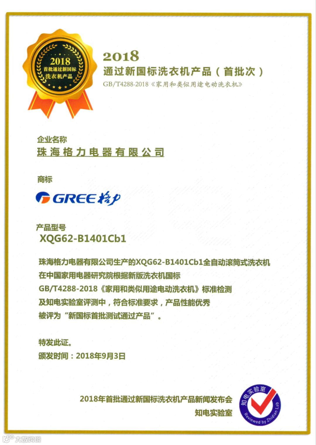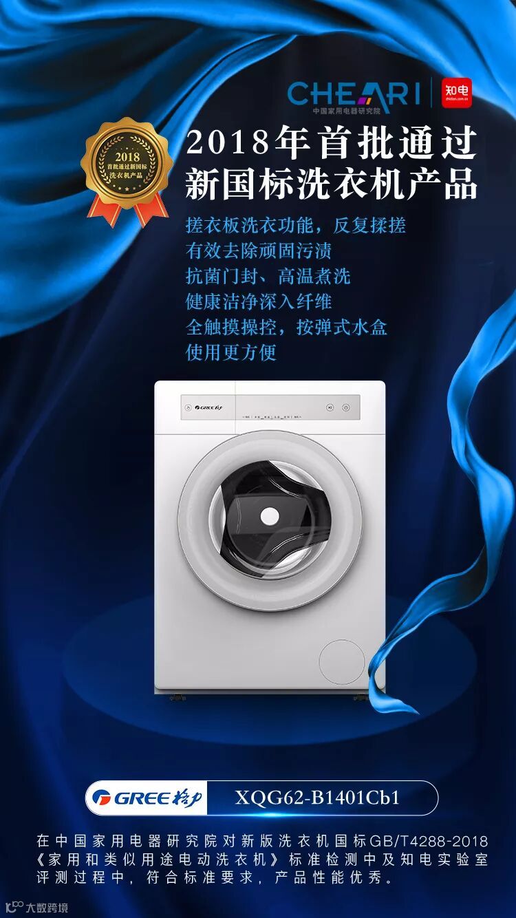 近日,由中国家用电器研究院主办,2018首批通过洗衣机新国标产品展示发布会在北京召开。格力全自动滚筒式洗衣机(XQG62-B1401Cb1)拿下“新国标”下首批进入洗衣机市场的“通行证”。