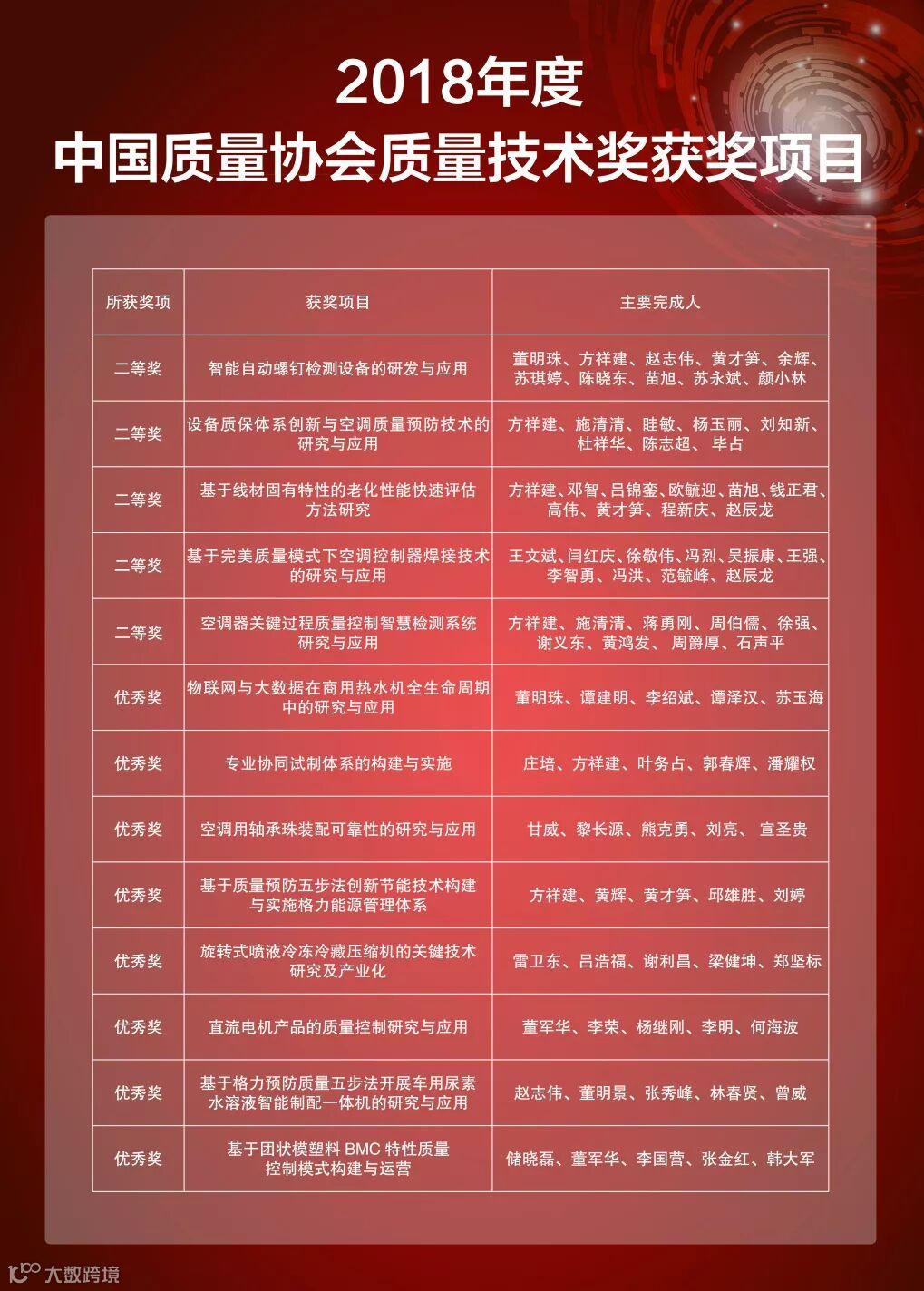 2018年质量技术奖评出了5项一等奖,26项二等奖,29项优秀奖,其中,格力电器及其子公司独占二等奖5项,优秀奖8项。此外,格力还斩获了11项六西格玛、精益管理、可靠性管理优秀项目,在获奖数量和专业领域内均表现亮眼。