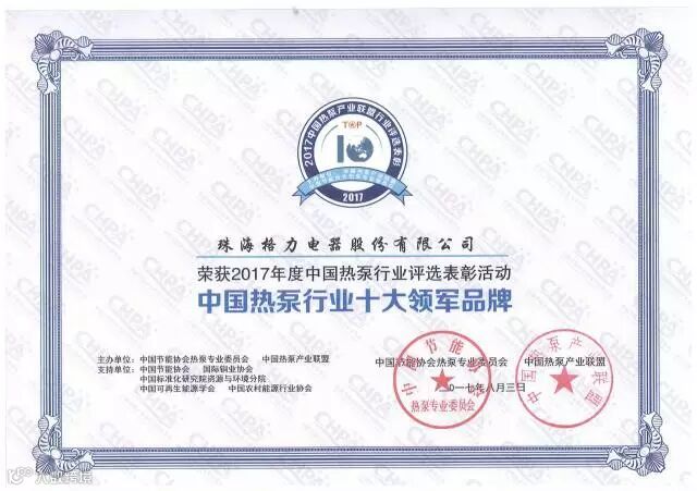 在本次大会进行的2017年中国空气源热泵行业评选颁奖仪式上,格力电器获得“中国热泵行业十大领军品牌”的殊荣。