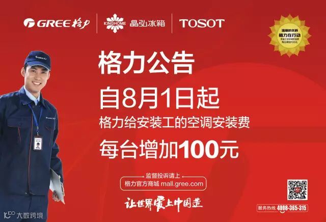 自2016年8月1日起,格力家用空调安装费在原有标准的基础上每台(套)增加100元,这将作为专项费用,由公司直接发放给安装工,杜绝任何中间克扣、截留。格力计划每年增加超40亿元的投入,为安装工们直接“加薪”。