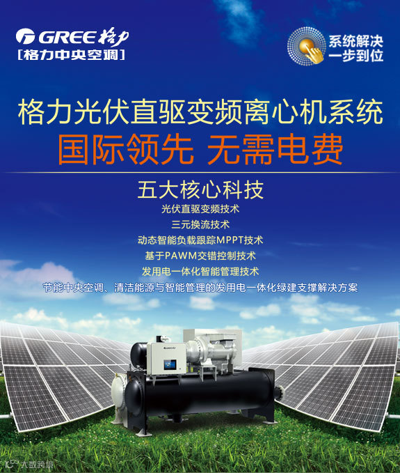 2013年12月21日,格力首次向全球推出不用电费的大型中央空调光伏直驱变频离心机,在此基础上,格力又将光伏节能技术运用到家用中央空调上,推出了光伏直驱变频多联机。