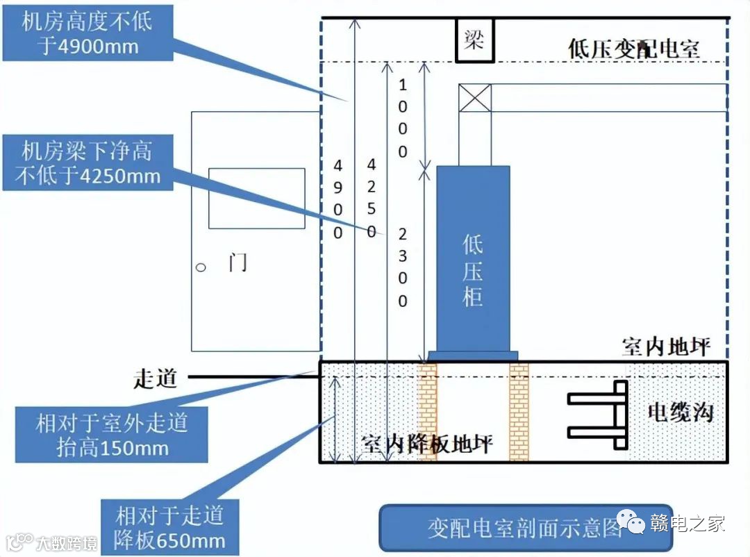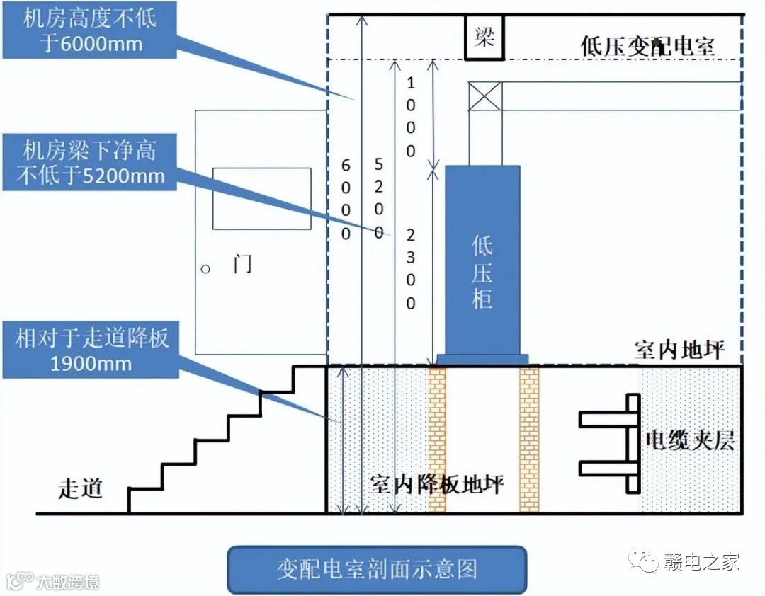 ◆ 若高低压室合用,此机房高度不低于6100mm,机房梁下净高不低于5300mm;