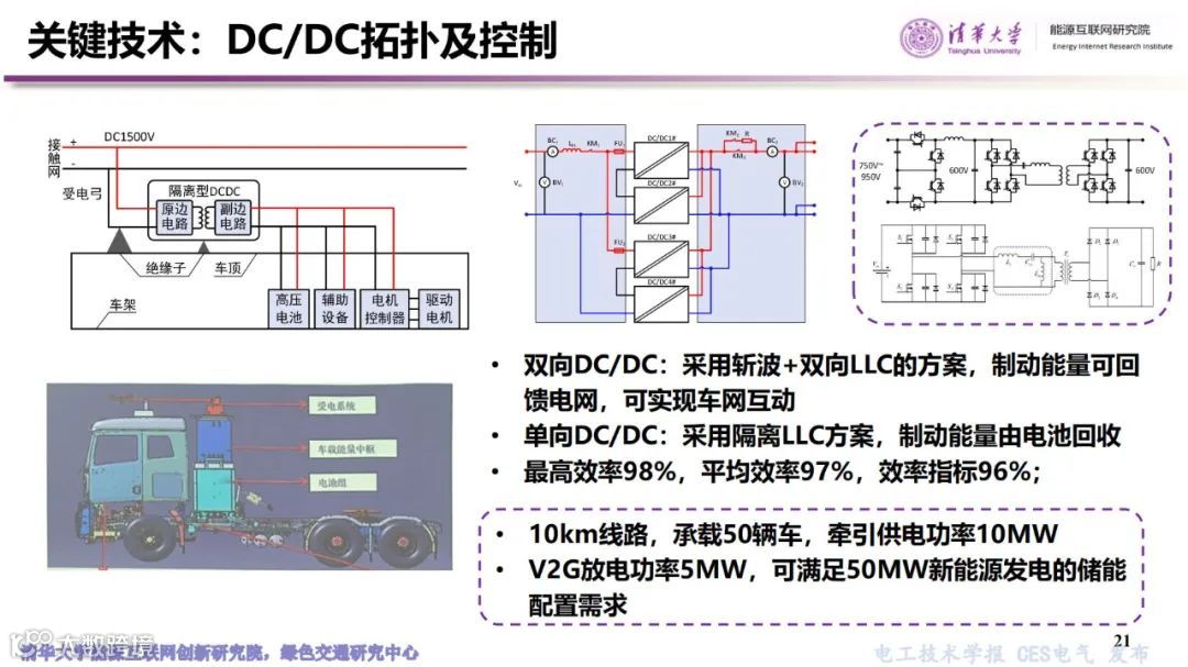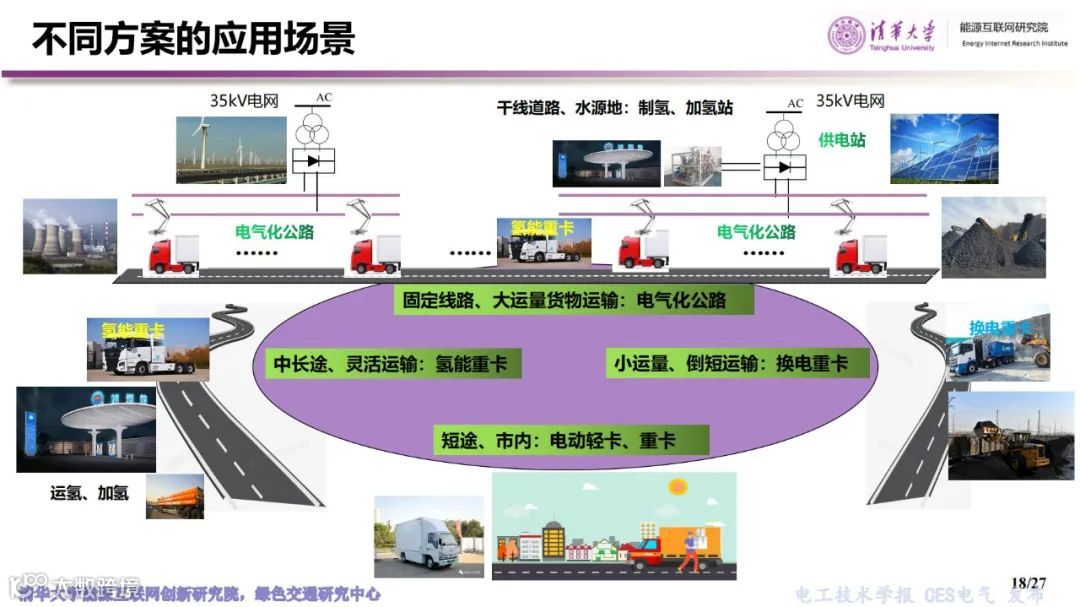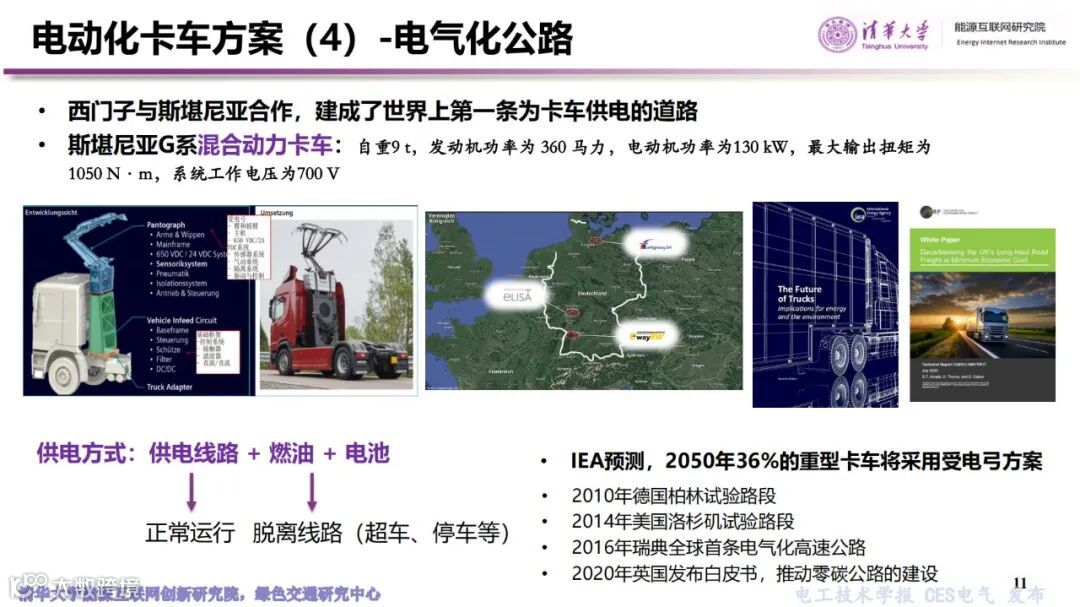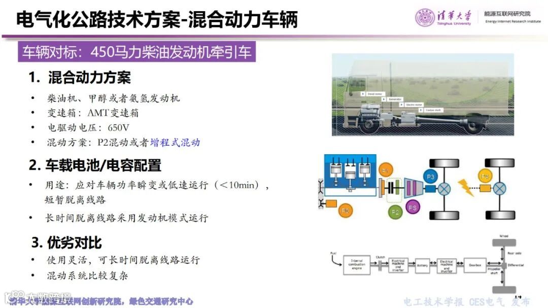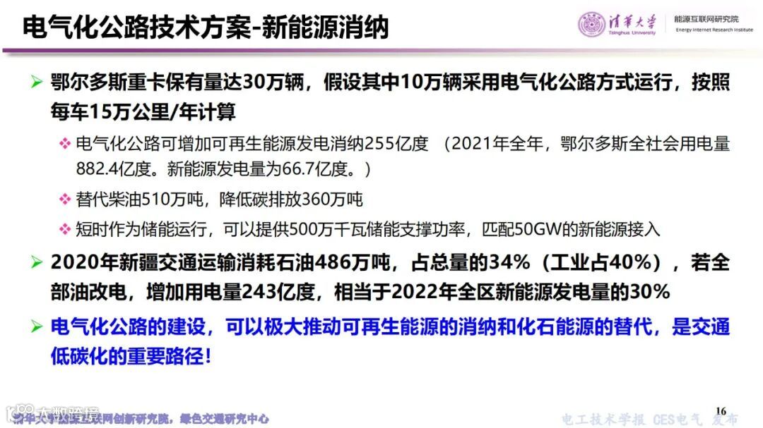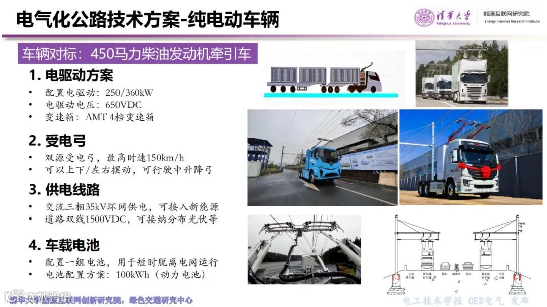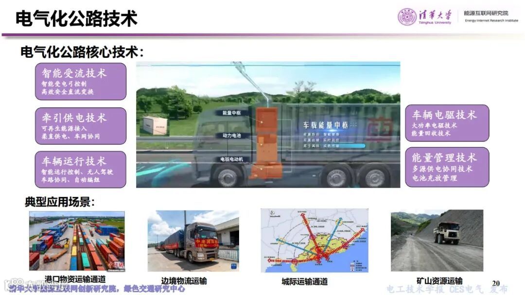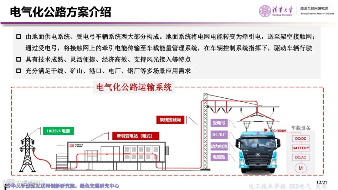 报告摘选 电气化公路方案:由地面供电系统、受电弓车辆系统两大部分构成。地面系统将电网电能转变为牵引电,送至架空接触网;通过受电弓,将接触网上的牵引电能传输至车载能量管理系统,在车辆控制系统指挥下,驱动车辆行驶具有技术成熟、灵活便捷、经济高效、支持风光接入等特点;充分满足干线、矿山、港口、电厂、钢厂等多场景应用需求。 电气化公路的建设,可以极大推动可再生能源的消纳和化石能源的替代,是交通低碳化的重要路径。 清华大学联合中车株洲电力机车研究所、三一重卡等,联合发布电气化公路系统解决方案。解决了电动重卡的电池重量、成本和行驶里程焦虑问题;融合可再生能源接入和智能车辆控制,车辆可自动驾驶、编组运行,并可实现车辆充放电与电网的协同互动。