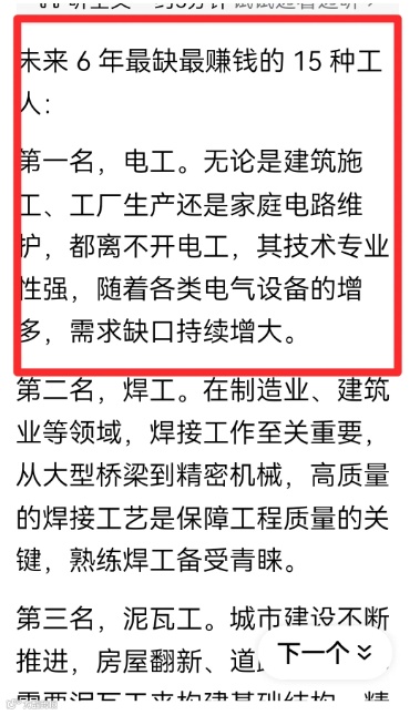 在网上看到了这么一则消息,说是电工是未来6年十五大最赚钱的工作,并且还排在第一名。我想说的是,要不是我在电气行业,这篇文章文章我就差点信了,该不是这篇文章是哪位电友编写的吧(开个玩笑)!话说,你们看到这则消息以后,你有什么看法没有呢?欢迎来评论区一起讨论一下吧!