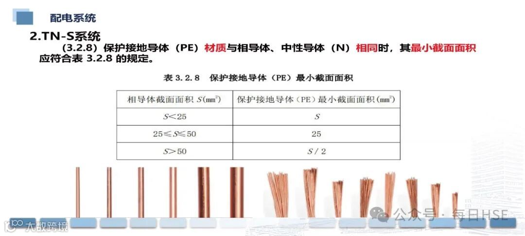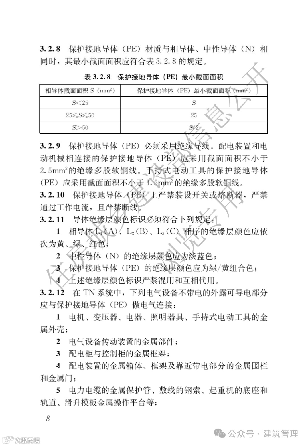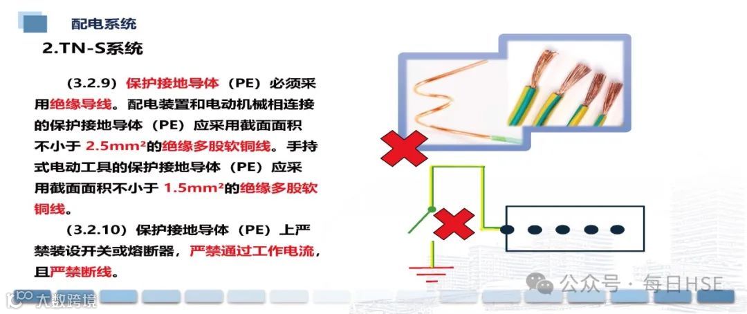 3.2.10 保护接地导体(PE)和保护接地中性导体(PEN)上严禁装设开关、断路器或熔断器;保护接地导体(PE)严禁通过工作电流,且严禁断线。