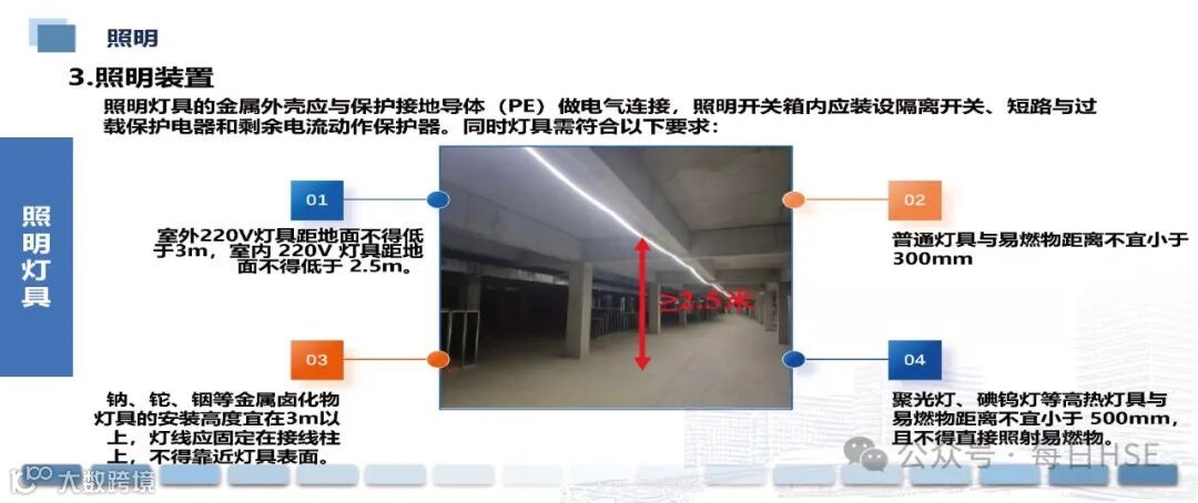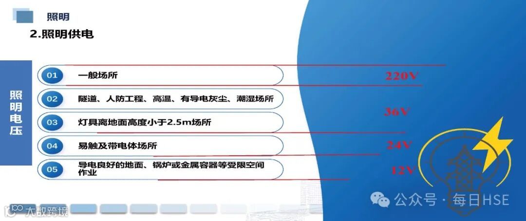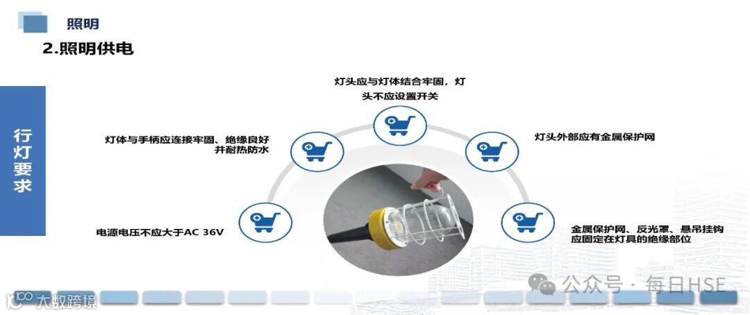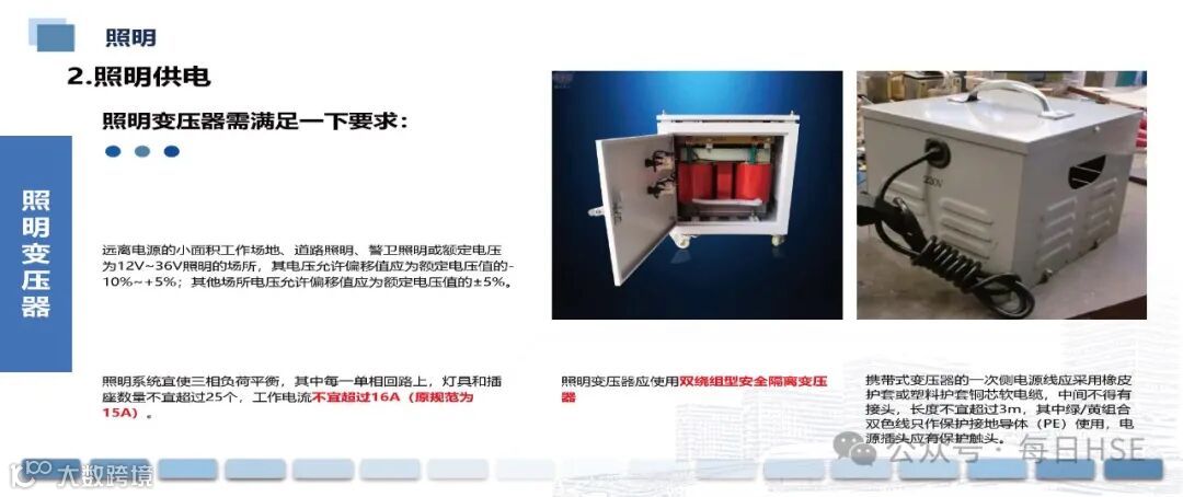 这一规定旨在提高照明系统的安全性。双绕组型安全隔离变压器可以有效隔离初级和次级电路,降低触电风险,特别适用于潮湿或导电性较强的施工环境。