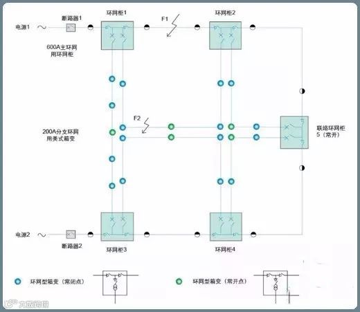 环网是指环形配电网,即供电干线形成一个闭合的环形,供电电源向这个环形干线供电,从干线上再一路一路地通过高压开关向外配电。这样的好处是,每一个配电支路既可以从它的左侧干线取电源,又可以从它右侧干线取电源。当左侧干线出了故障,它就从右侧干线继续得到供电,而当右侧干线出了故障,它就从左侧干线继续得到供电,这样一来,尽管总电源是单路供电的,但从每一个配电支路来说却得到类似于双路供电的实惠,从而提高了供电的可靠性。