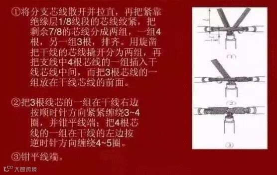不过也有一种施工简单些的方式:把支路芯线90°折弯后与干路芯线并行,之后再将线头折回并紧密缠绕在芯线上就可以了。