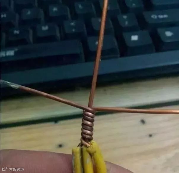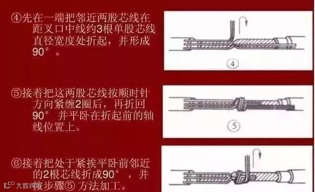 把两根缠绕导线缠绕3~4圈后扳直开来,把被缠绕的两根(1根)导线扳成90°,再缠绕3~4圈为宜。
