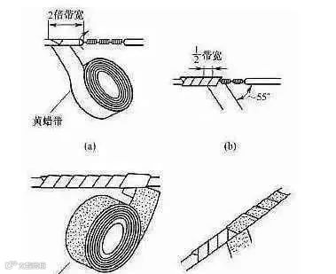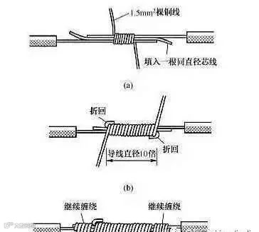 首先把2导线的芯线重叠处填入1根相同直径的芯线,之后用1根截面约1.5平方的裸铜线在其上紧密缠绕,缠绕长度为导线直径的10倍左右为宜。