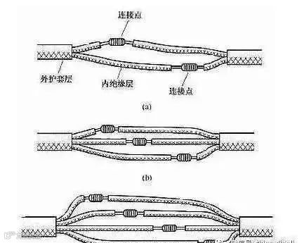 4、多芯、双芯的导线接线跟芯线的接线方法如前面所讲的,差别就在于,各芯线的连接点相互错开位置,就是为了防止线间短路或漏电。