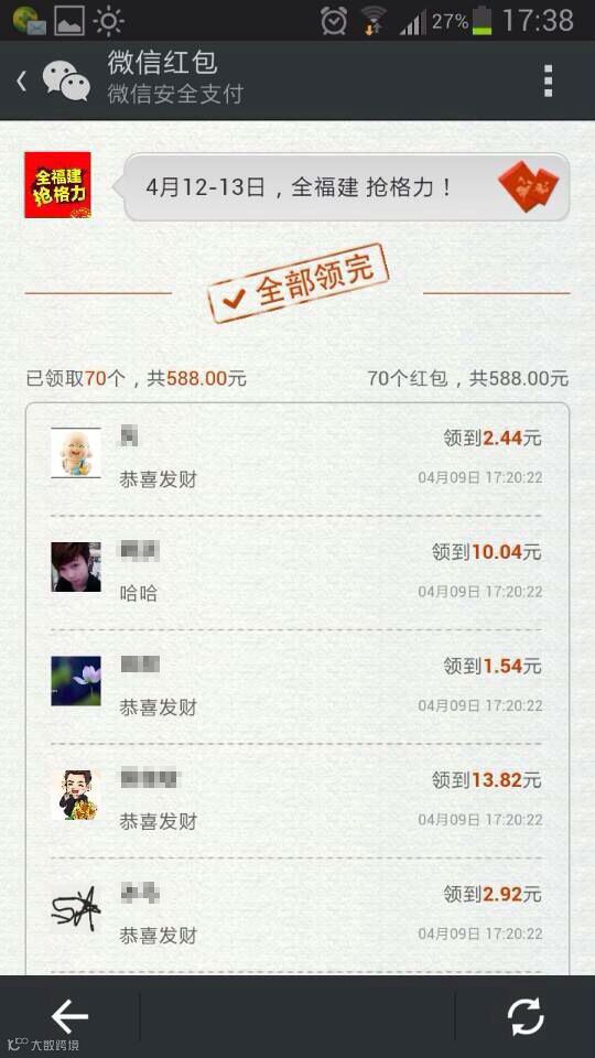 第三天现金红包已发放完毕,具体明细如下图。明日将进行1088元大红包疯狂抢,敬请期待!