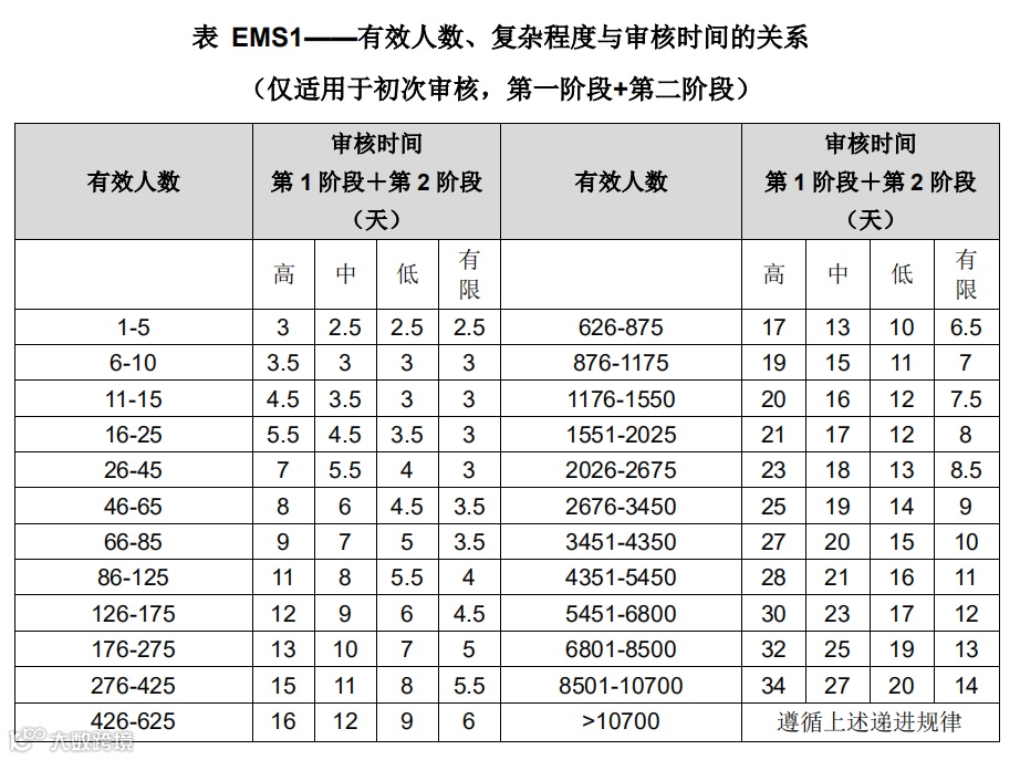 3. 认证机构的程序可以规定人数超过 10700 人时对审核时间的计算。该审核时间宜遵循表 EMS 1 中的递进规律,与该表保持一致。