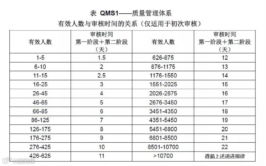 2. 认证机构的程序可以规定人数超过 10700 人时对审核时间的计算。该审核时间宜遵循表 QMS 1 中的递进规律,与该表保持一致。