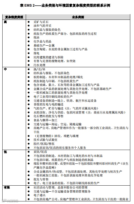 表 EMS 2 将上述 5 种复杂程度类型与每种类型所覆盖的典型行业做了对照。认证机构宜认识到,在一个特定行业中,并不是所有组织都属于相同的复杂程度类型。认证机构的申请评审程序宜具有一定的灵活性,以确保在确定组织的复杂程度类型时考虑该组织的具体活动。