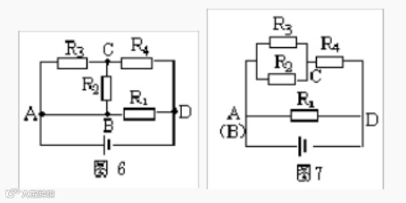 解:电流从电源正极流出过A点分为三路(AB导线可缩为一点),经外电路巡行一周,由D点流入电源负极。第一路经R1直达D点,第二路经R2到达C点,第三路经R3也到达C点,显然R2和R3接联在AC两点之间为并联。二、三络电流同汇于c点经R4到达D点,可知R2、R3并联后与R4串联,再与R1并联,如图7所示。
