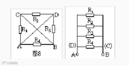 解:设想把A、B两点分别接到电源的正负极上进行分析,A、D两点电势相等,B、C两点电势也相等,分别画成两条线段。电阻R1接在A、C两点,也即接在A、B两点;R2接在C、D两点,也即接在B、A两点;R3接在D、B两点,也即接在A、B两点,R4也接在A、B两点,可见四个电阻都接在A、B两点之间均为并联(图9)。所以,PAB=3Ω。