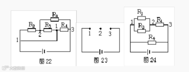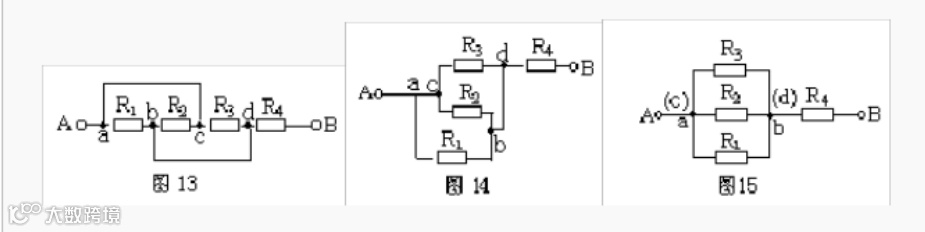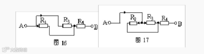 仍以图13为例,设电流由A端流入,B端流出,先撤去R2,由图16可知R1、R3有电流通过。再撤去电阻R1,由图17可知R2、R3仍有电流通过。同理撤去电阻R3时,R1、R2也有电流通过由并联电路的特点可知,R1、R2和R3并联,再与R4串联。