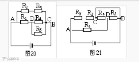 方案三:选取A—R2—R3—C—R4—D—R5—B为一条独立支路,再把R1接到AD之间,导线接在C、B之间,如图21所示,结果仍无法直观判断电阻的串并联关系,所以选取独立支路时一定要将无阻导线包含进去。